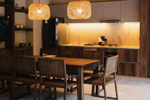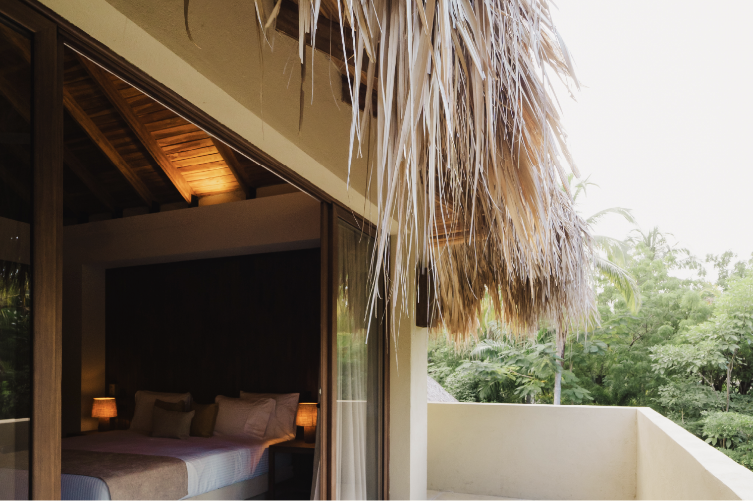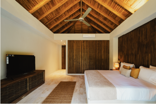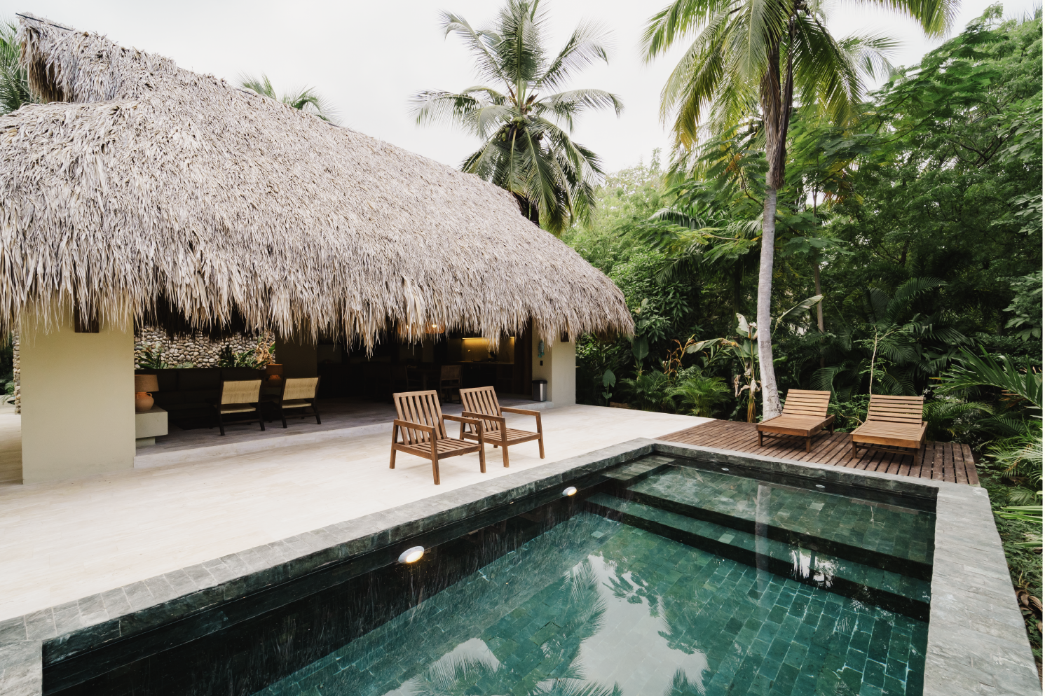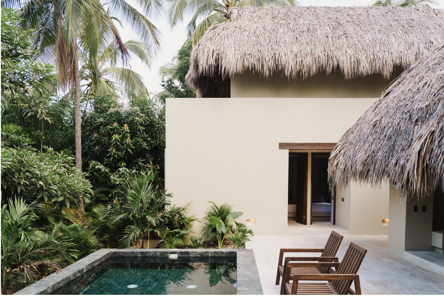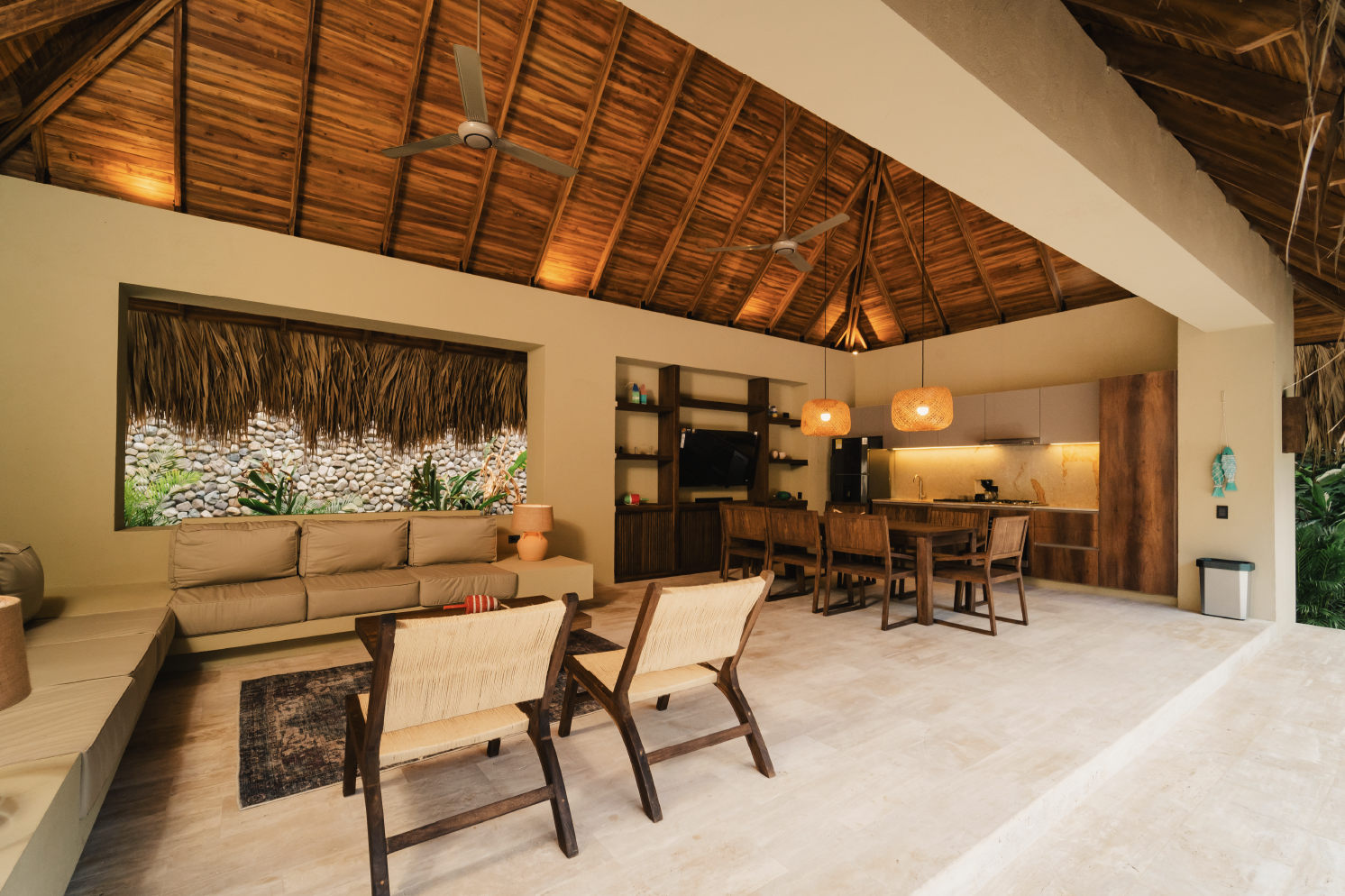 La casa tiene 145m2 construidos y 135m2 de terraza, distribuida en una tipología en L y construida con techo de palma. La casa cuenta con un área social amplia con sala, cocina, comedor y piscina privada. En el primer piso se encuentran dos habitaciones con dos baños y en el segundo la habitación principal con su baño y terraza privada para un total de 3 cuartos