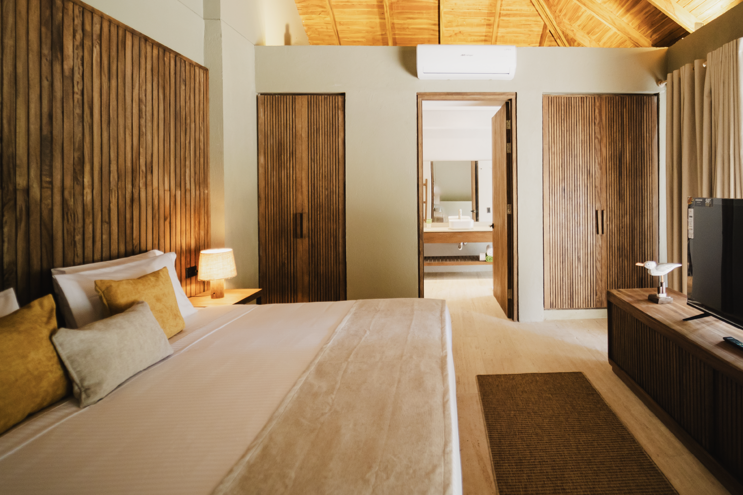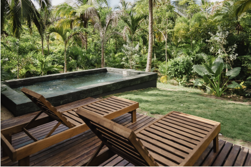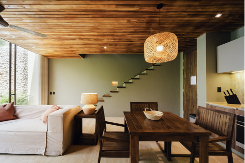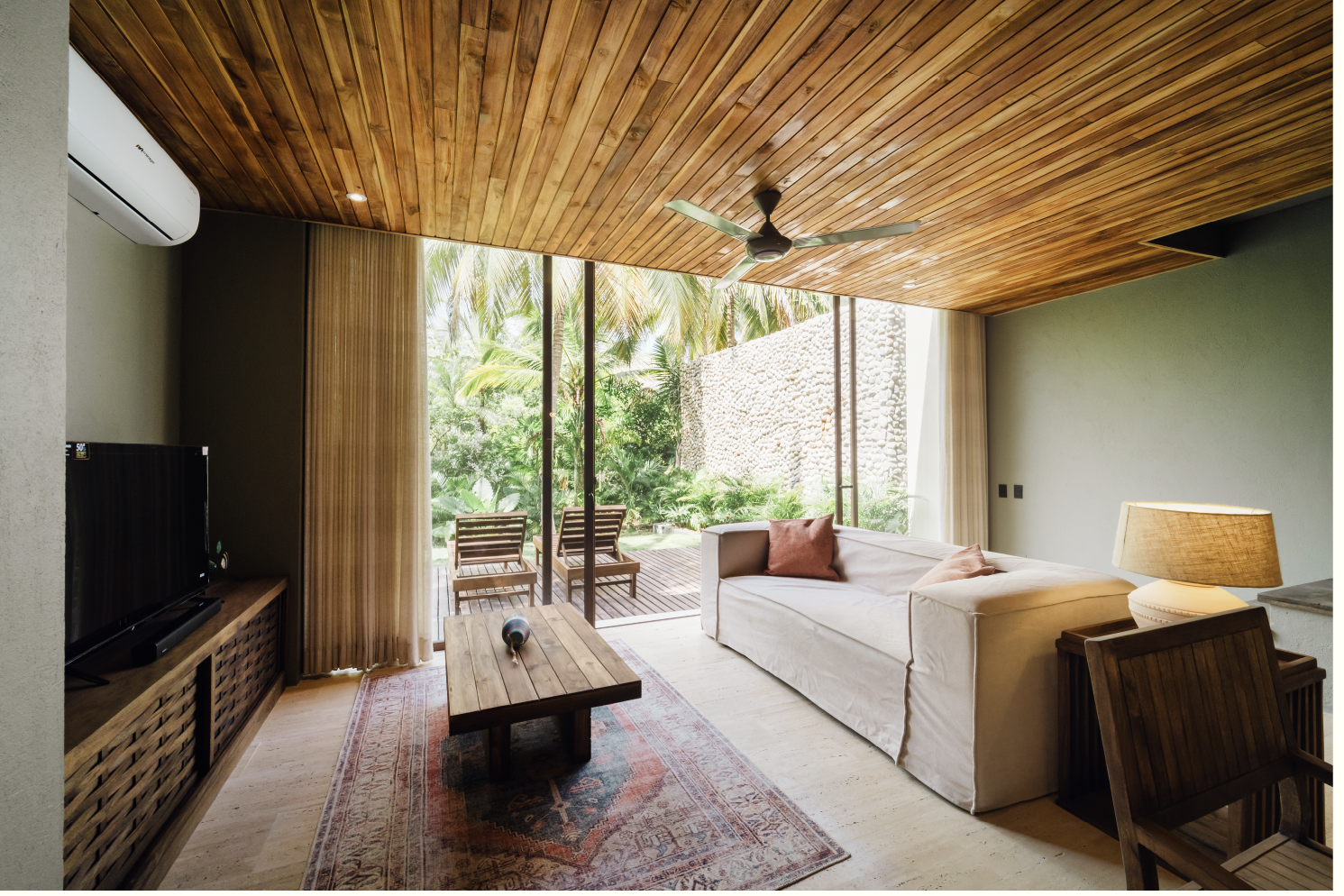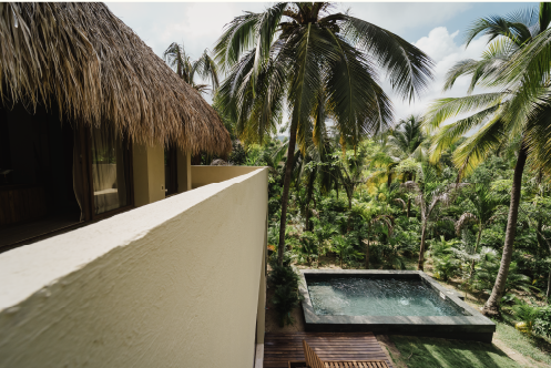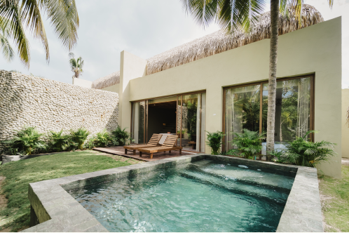 La villa mediana cuenta con dos habitaciones en 105m2 interiores, al igual que 56m2 de terraza exterior privada con una pequeña piscina y un jardín de plantas nativas y tropicales. Esta villa se distribuye en dos niveles. En el primero, se encuentra la zona social, cocina, terraza con piscina y la alcoba de invitados con su baño completo. En el segundo está la habitación principal con baño, closet y terraza privada