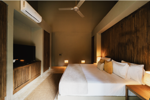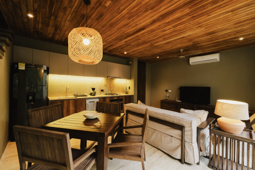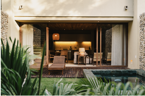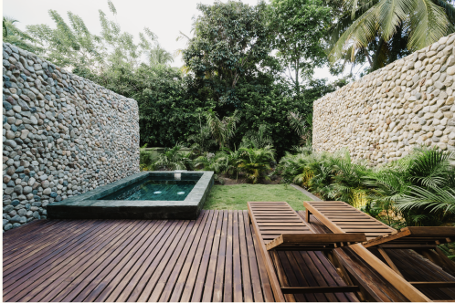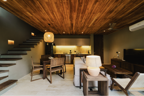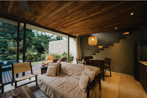 Esta villa cuenta con 70m2 interiores y 45m2 de terraza exterior privada con una pequeña piscina, además de un jardín de plantas nativas y tropicales. Se distribuye en dos niveles: en el primero se encuentra el área social con sofá, cocina, la terraza con piscina y el jardín. En el segundo, está dispuesta la habitación principal con su baño y una terraza privada.